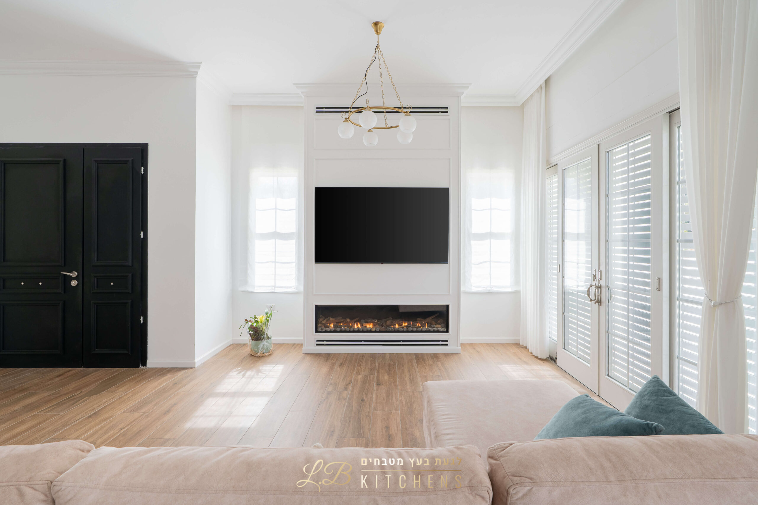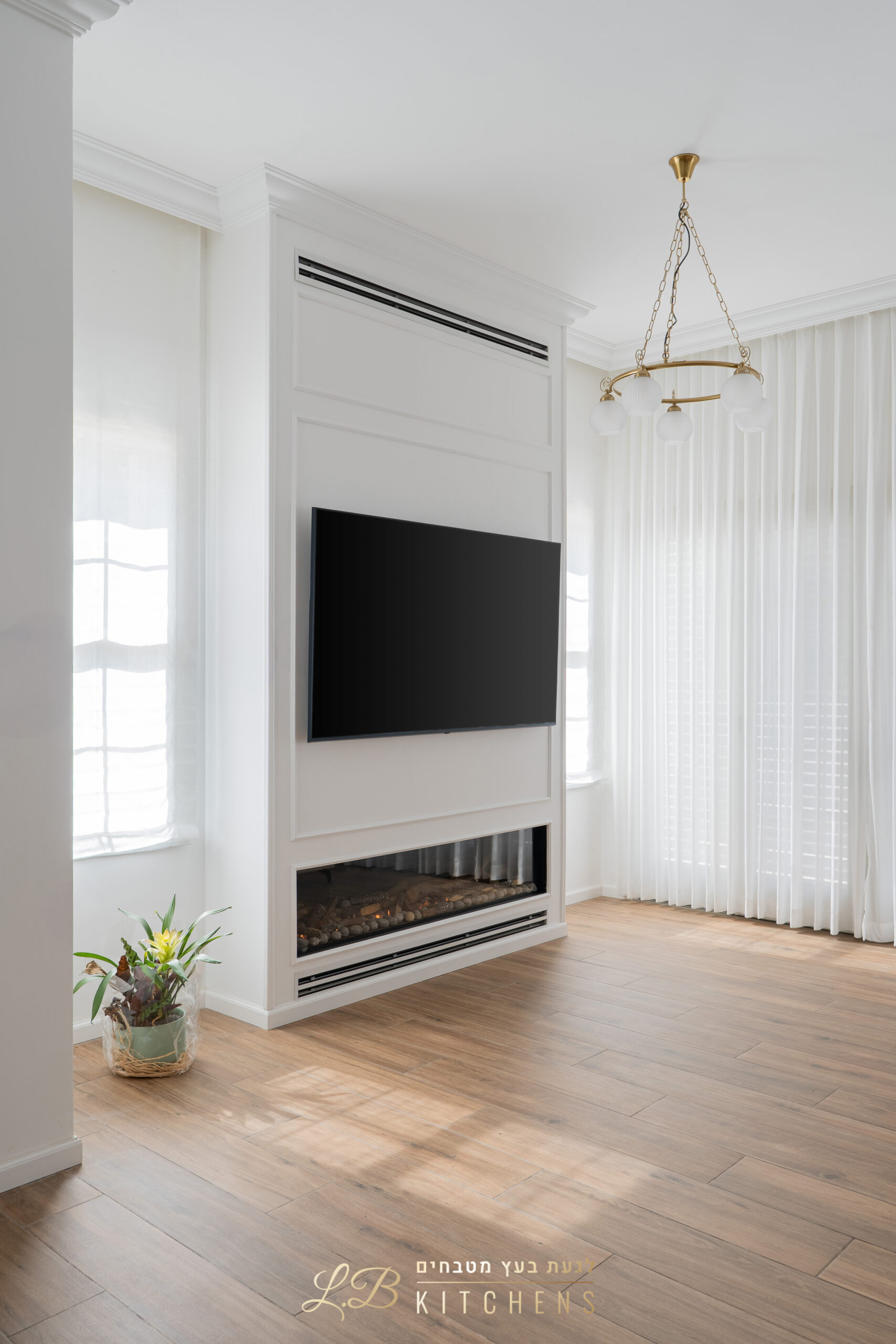 יחידת נגרות יוקרתית שמביאה עיצוב מתקדם, חומרים איכותיים ותכנון מוקפד – וכל זה תוך שמירה על מראה נקי, אלגנטי ומרשים. הקיר כולל נישה מותאמת למסך טלוויזיה, מדפי זכוכית מוארים, וקמין חשמלי דקורטיבי שמשלים את האווירה.